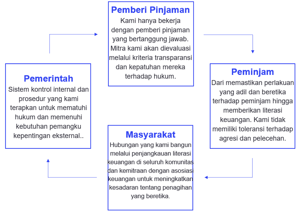 Kami juga sangat yakin bahwa ethical lending memiliki dampak signifikan pada peminjam yang berhutang dan hanya bekerjasama dengan pemberi pinjaman yang beretika. Masalah penagihan hutang bisa menjadi tantangan dan stres. Kami berkomitmen untuk mempromosikan penagihan yang bertanggung jawab dan inklusi keuangan untuk memberdayakan konsumen di negara yang kurang terlayani.
