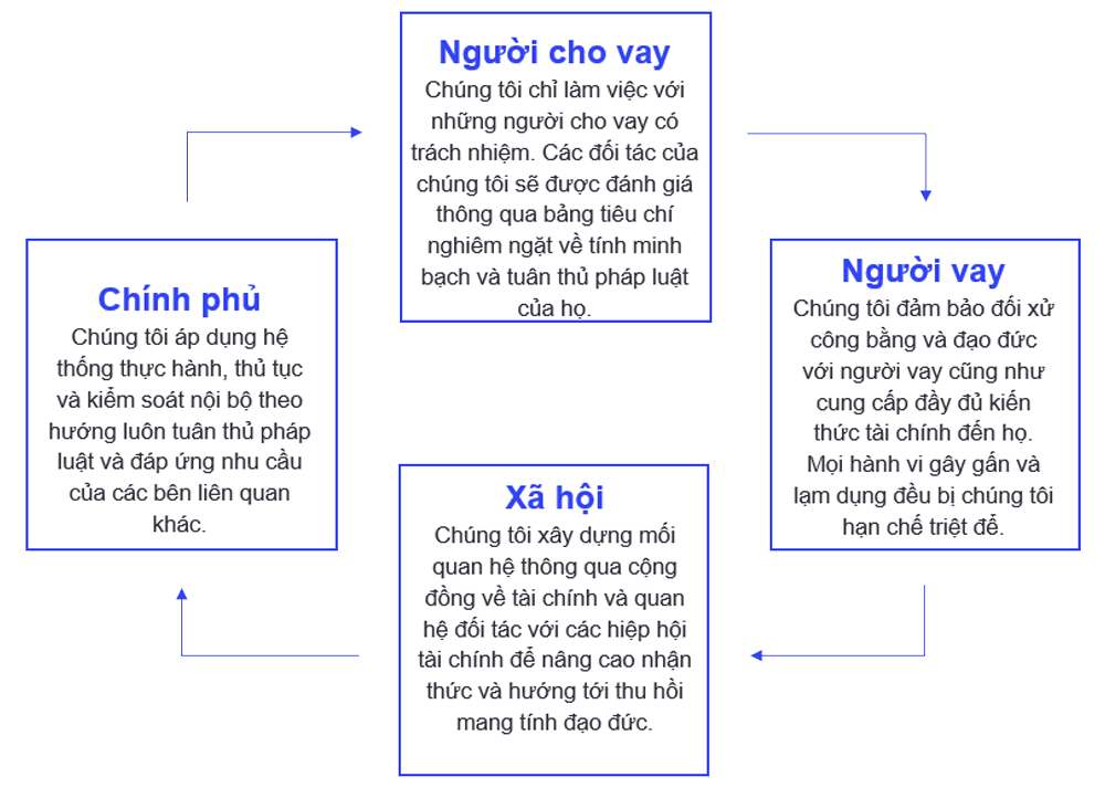 Chúng tôi tin tưởng rằng, quy trình xử lý tín dụng lấy đạo đức làm cơ sở có ảnh hưởng mạnh mẽ đến hoạt động vay của khách hàng và chỉ hiệu quả với những tổ chức cho vay có trách nhiệm, đặt quy tắc đạo đức lên hàng đầu. Vấn đề quản lý khoản vay có tính chất phức tạp và gặp nhiều thử thách. Tại Flow, chúng tôi hướng đến hình thức thu hồi có trách nhiệm, đồng thời hỗ trợ tư vấn giải pháp tài chính tới các khách hàng đang gặp vấn đề trong việc tất toán khoản vay.